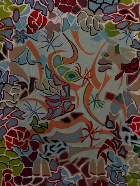 Gut ausbalancierte helle und dunkle Töne und schwarze Umrisslinien erzeugen starke Kontraste und geben den abstrakten Bild Struktur. Viele der Formen erinnern an natürliche Elemente.