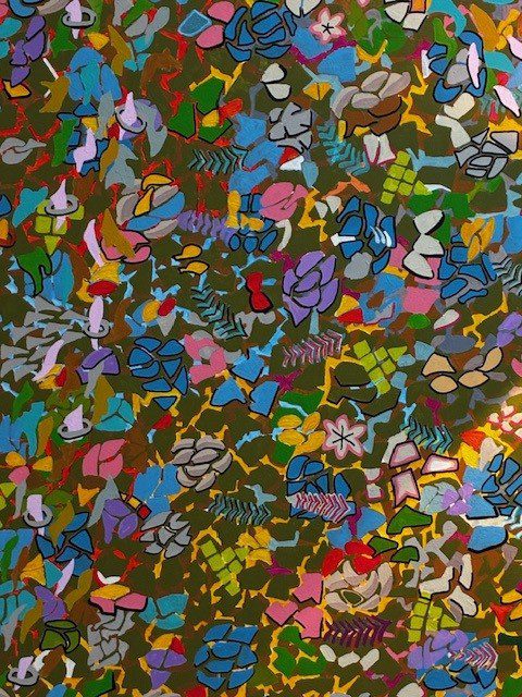 Ein vibrierendes Farbspiel aus unzähligen, scheinbar frei schwebenden Formen breitet sich über die Leinwand aus. In leuchtenden Tönen von Blau, Rosa, Grün und Gelb überlagern sich organische Fragmente und erinnern an Blätter, Blüten oder Lichtreflexe auf Wasser.